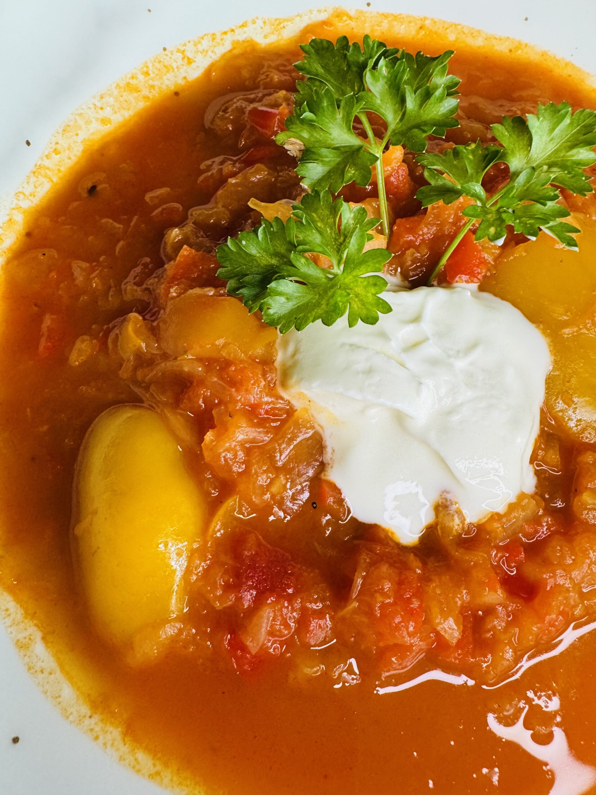 In dem Eintopf sind stückige Tomaten, Sauerkraut, Zwiebeln, Paprika und natürlich Gewürze enthalten.