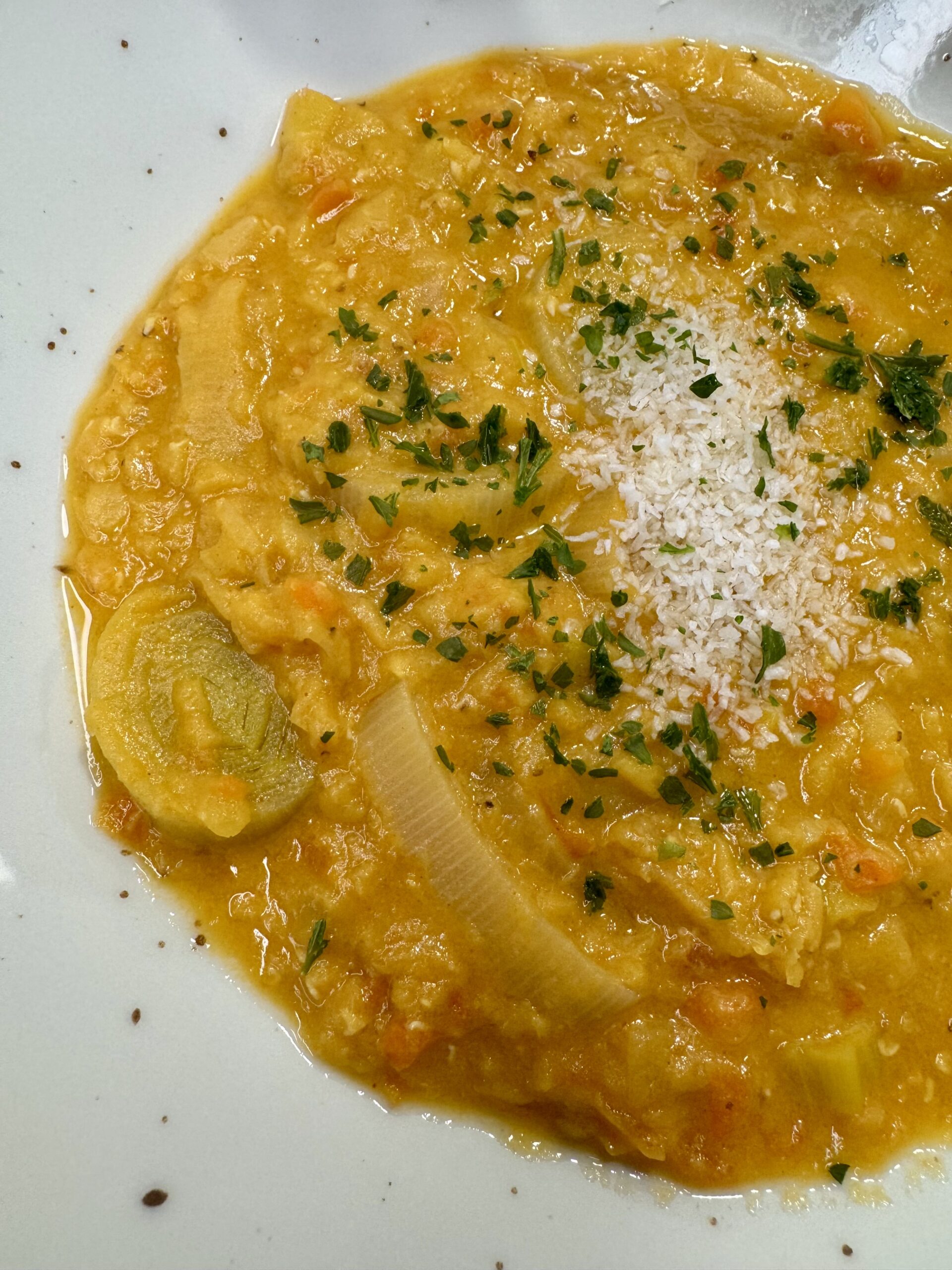 ➡️ Porree, Wasser, Gewürzpaste, Linsen, viele schöne Gewürze, Kokosmilch zugeben, kochen