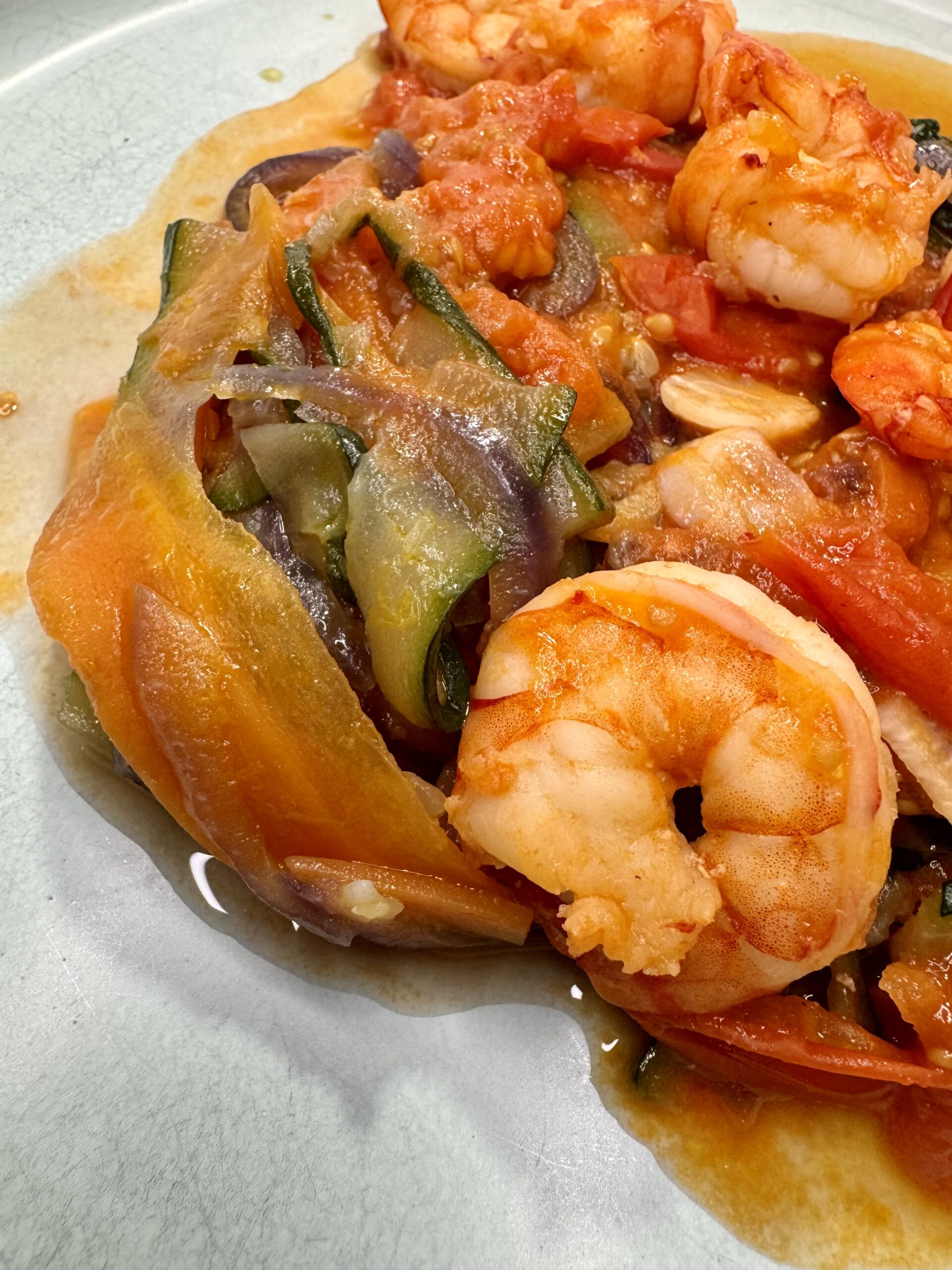 Der Thermomix hat erst Knoblauch, Zwiebeln, Möhren und Zucchini angebraten und dann die Garnelen. Die natürlich auch mit ordentlich Knoblauch und noch ein paar Tomaten. 🥳