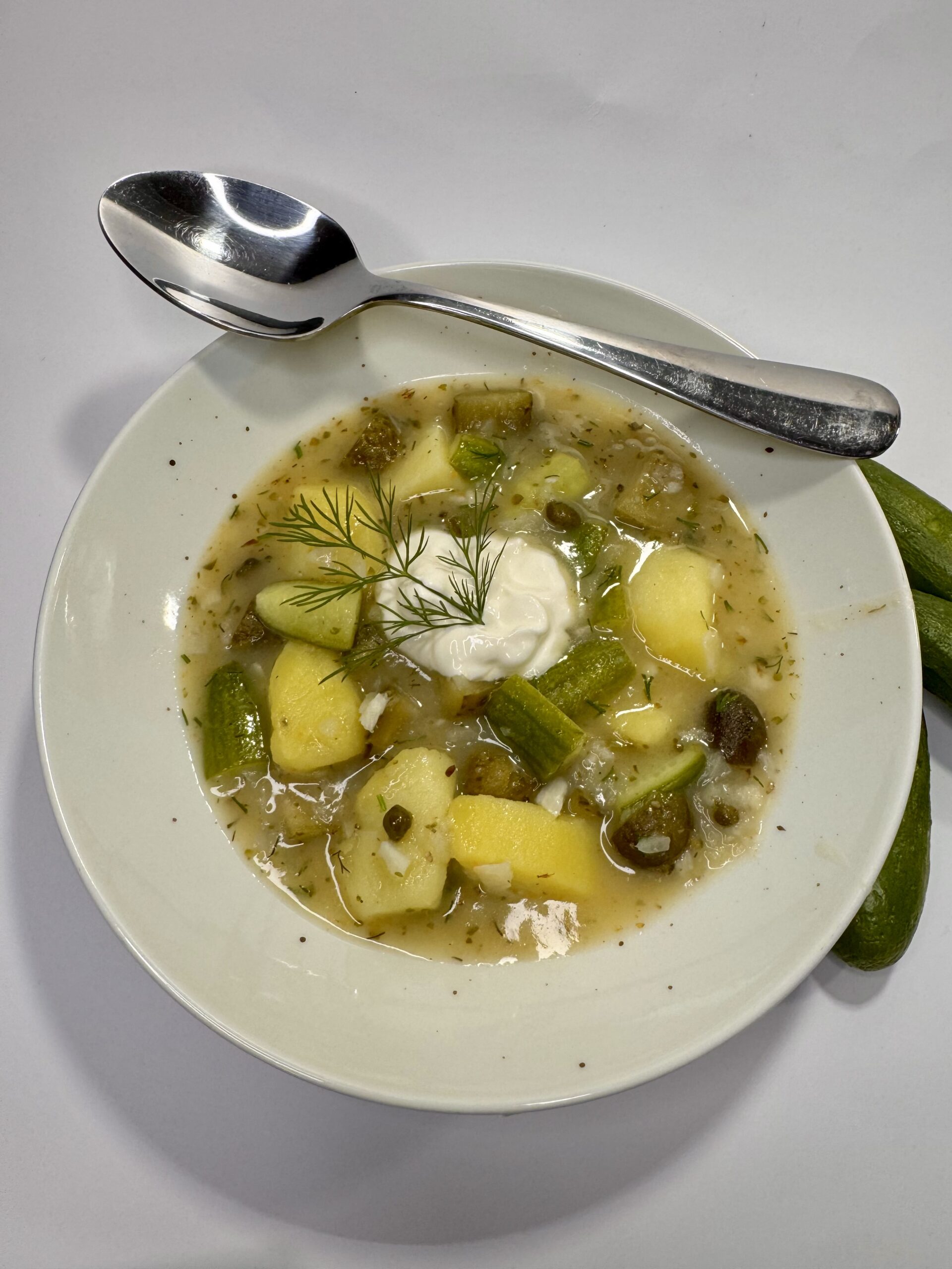 Das ist eine echt besondere Suppe. Sie kommt aus Ostereich. Man kann sie auch mit Knacker oder anderer Wurst machen und ursprünglich war das eine Resteverwertung von Kartoffeln vom Vortag. 😉