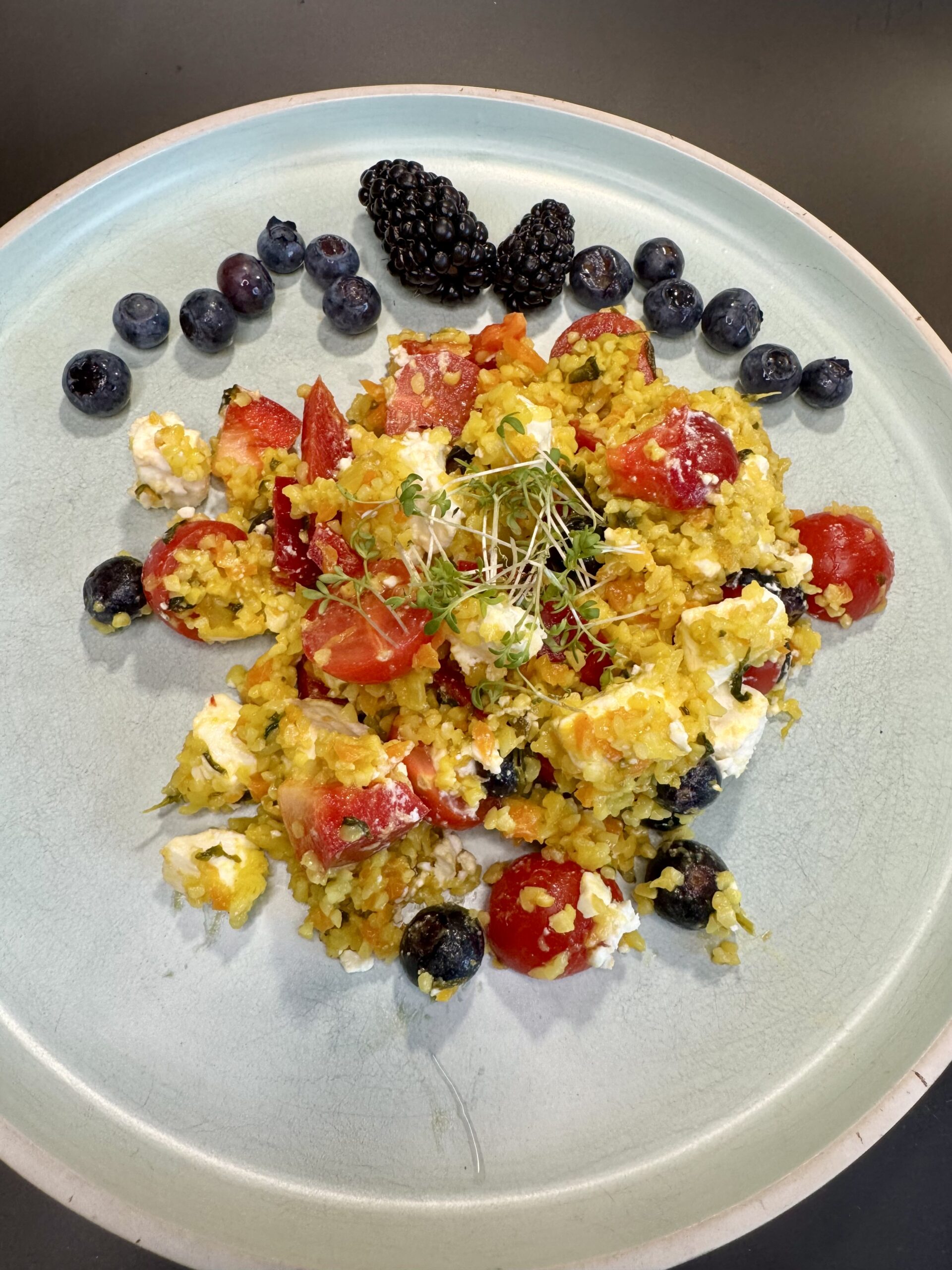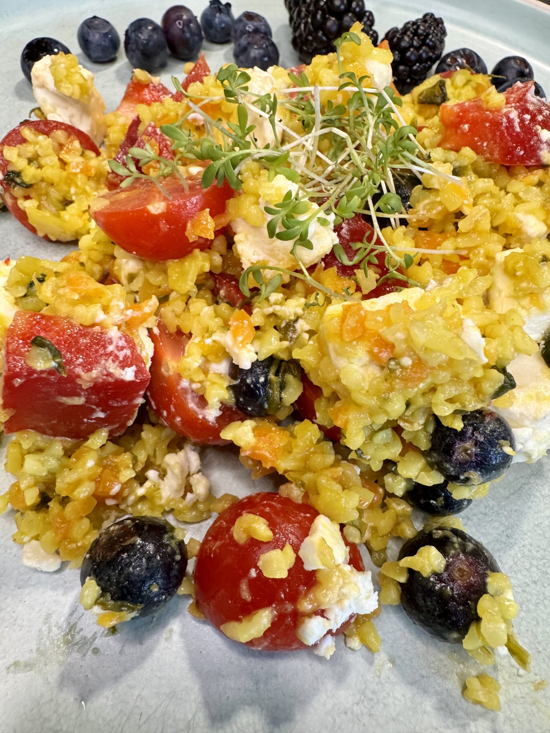 In dieser Zeit hab ich die Tomaten halbiert, eine Paprika und Feta in Würfel geschnitten und ein paar Heidelbeeren abgewaschen.