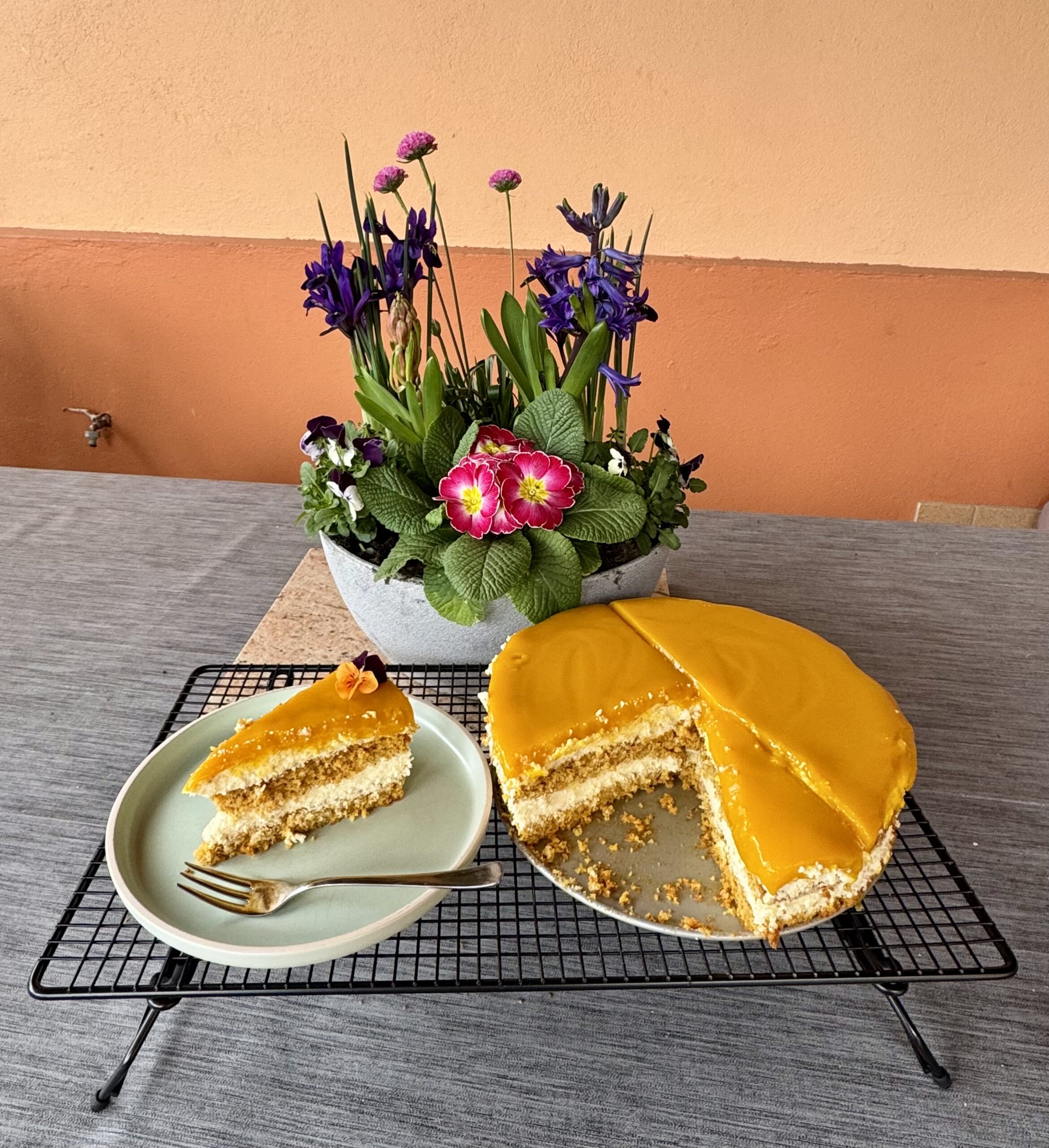 Die Creme ist weiße Schokolade, Sahne und Gelatine und oben drauf kommt ein Mango Fruchtspiegel. 🥭