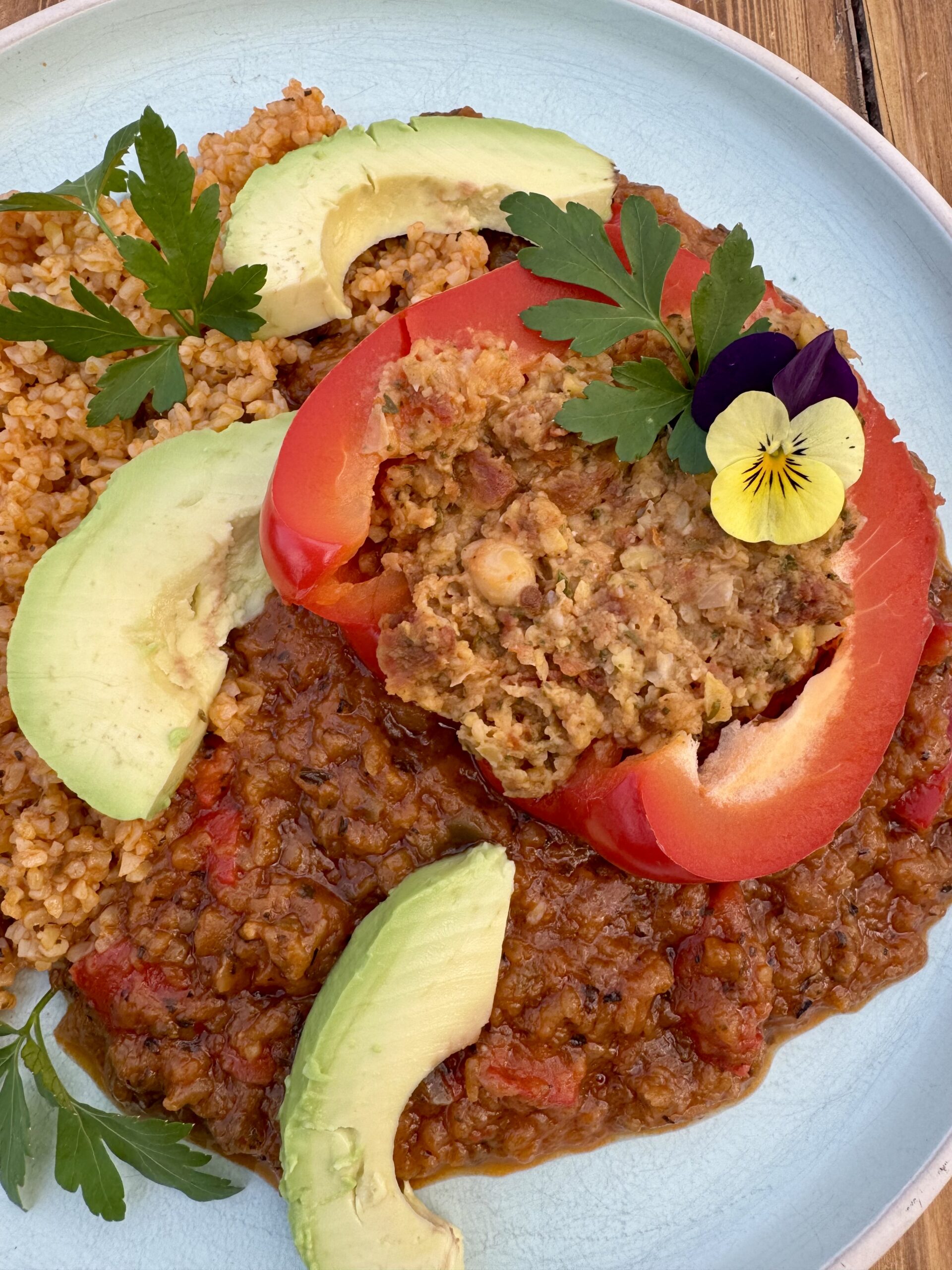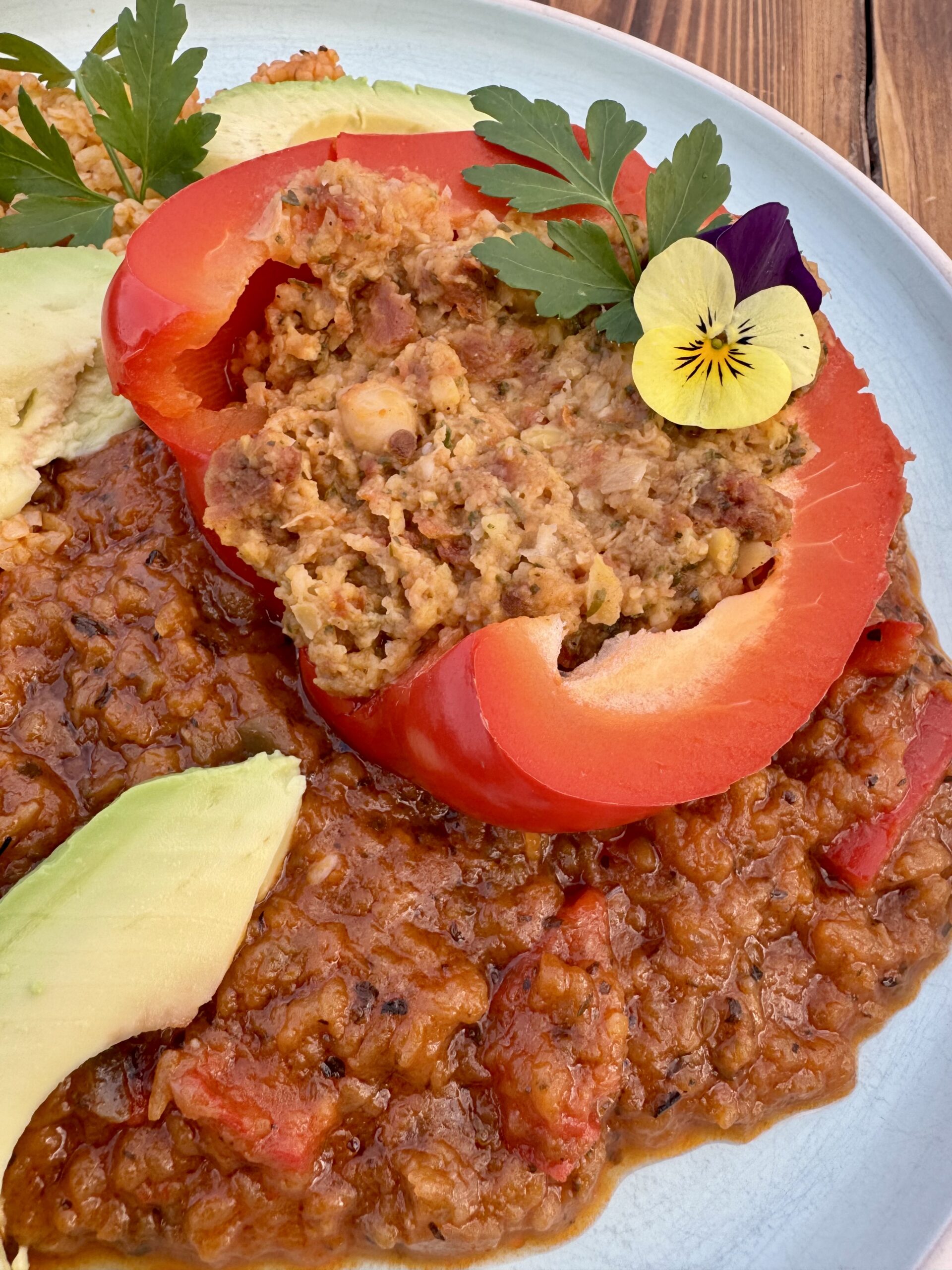 Paprikaschoten, ich lieb sie ja in allen Varianten, aber heute mal mit einer Füllung aus Kichererbsen und getrockneten Tomaten die mit einem schönen, im Thermomix hergestelltem Kräuteröl püriert wurden. 😋
