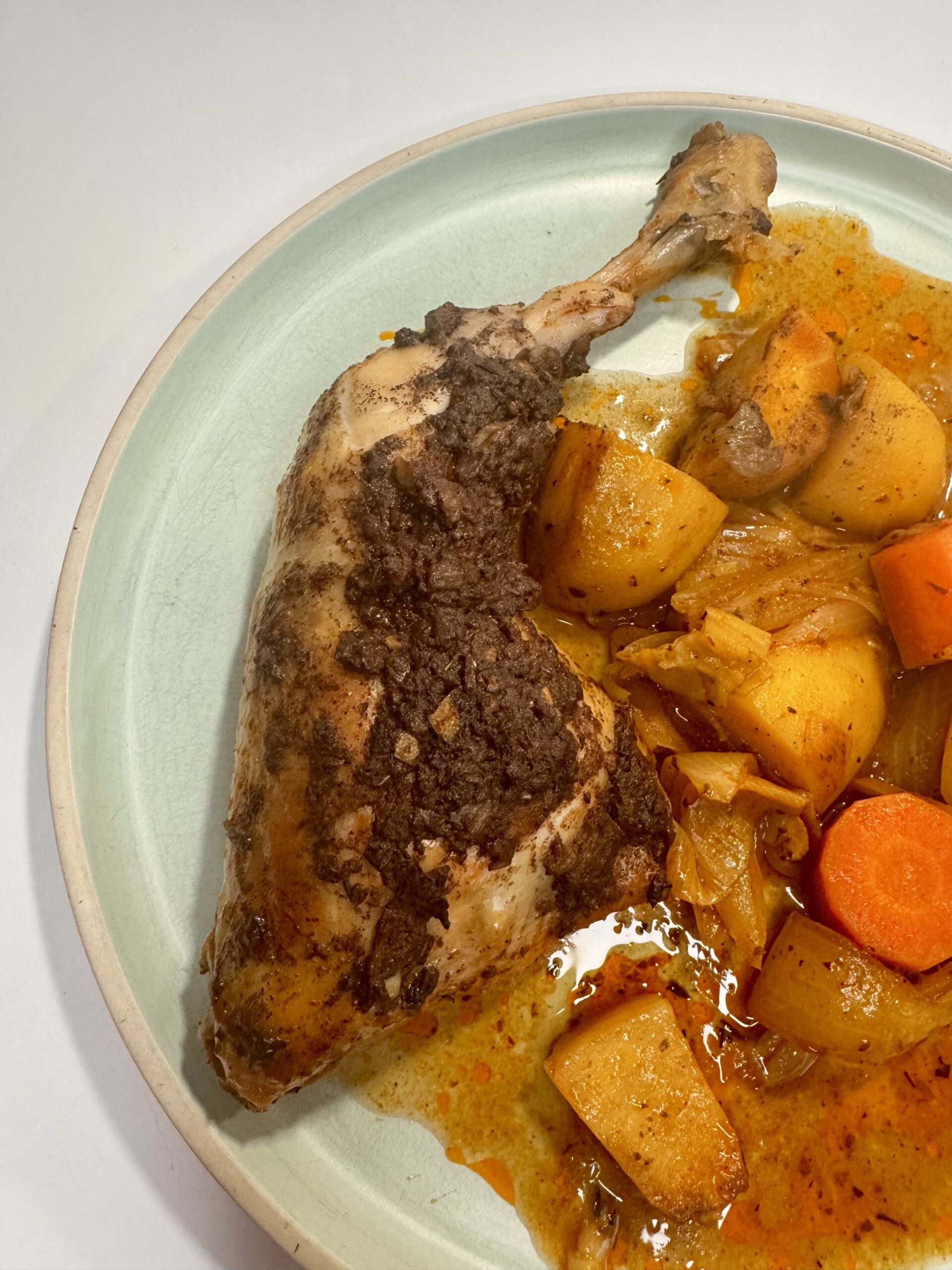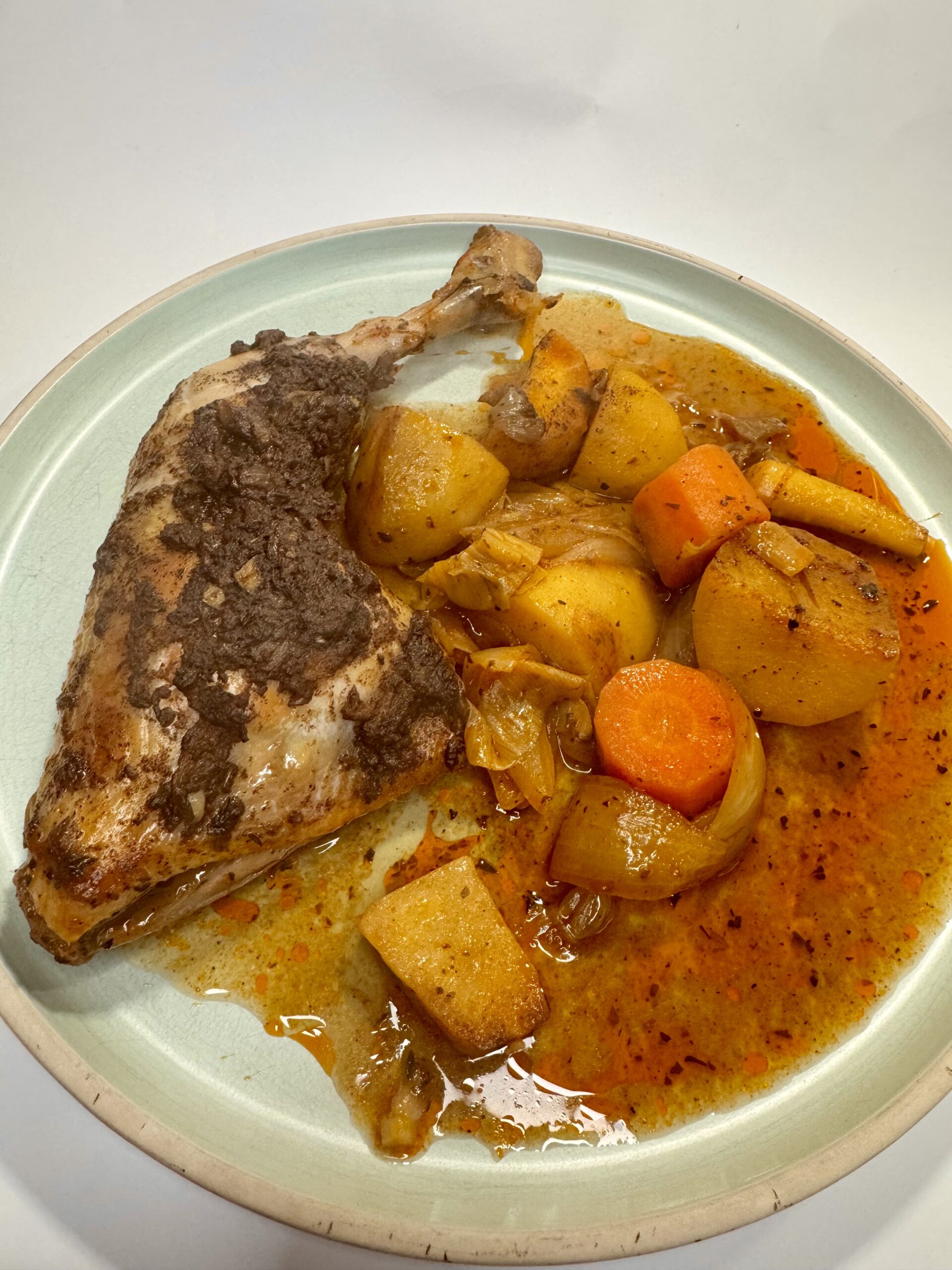 Danach wurden Pastinake, Porree, Möhren und bei mir zusätzlich Kartoffeln und ganz viele Gewürze gedünstet, mit Geflügelfond aufgegossen gekocht und ebenfalls in die Ofenhexe gegeben. Alles gut vermischt und oben drauf kamen die Hähnchenschenkel und noch der Rest der Marinade.
