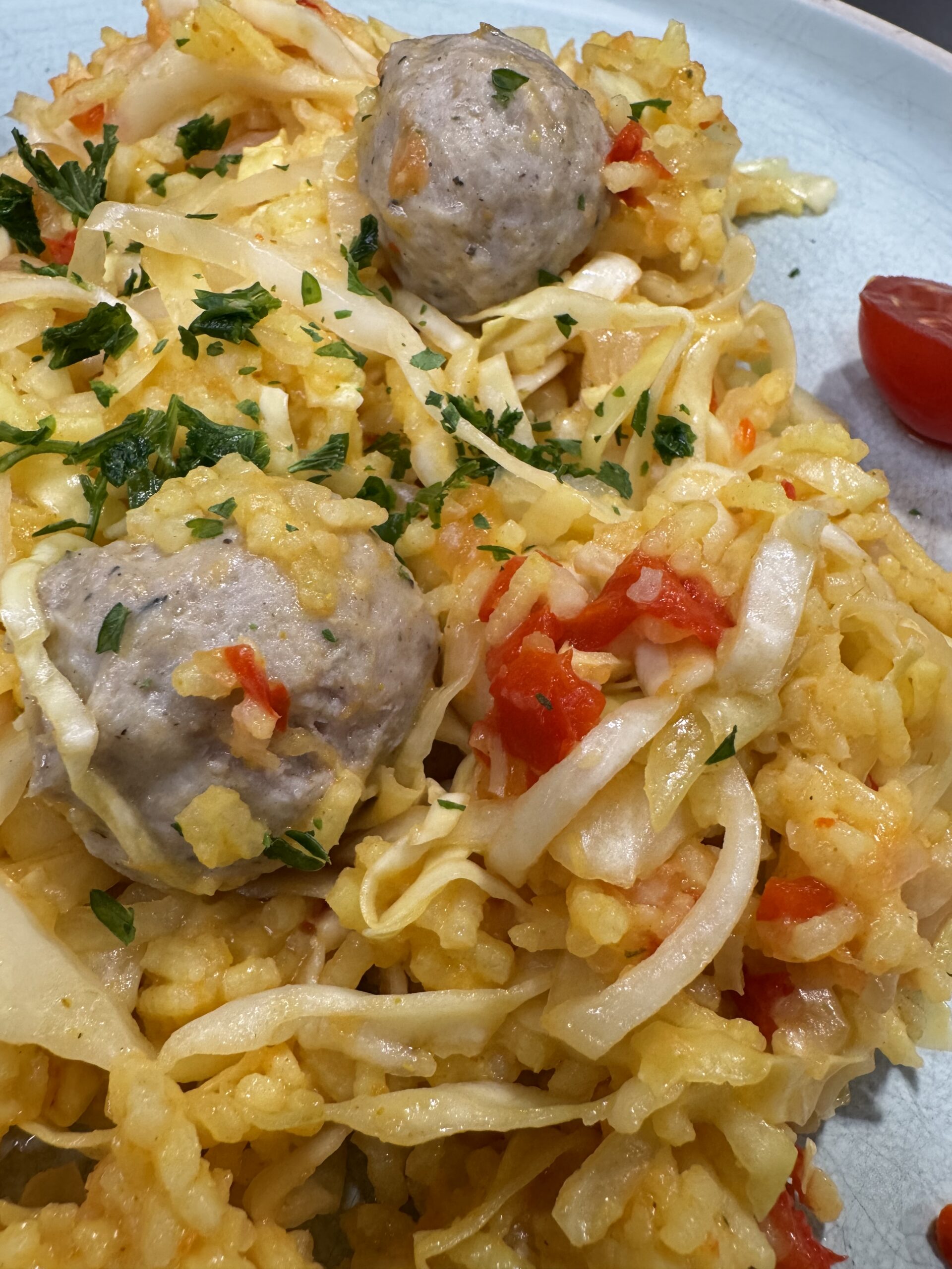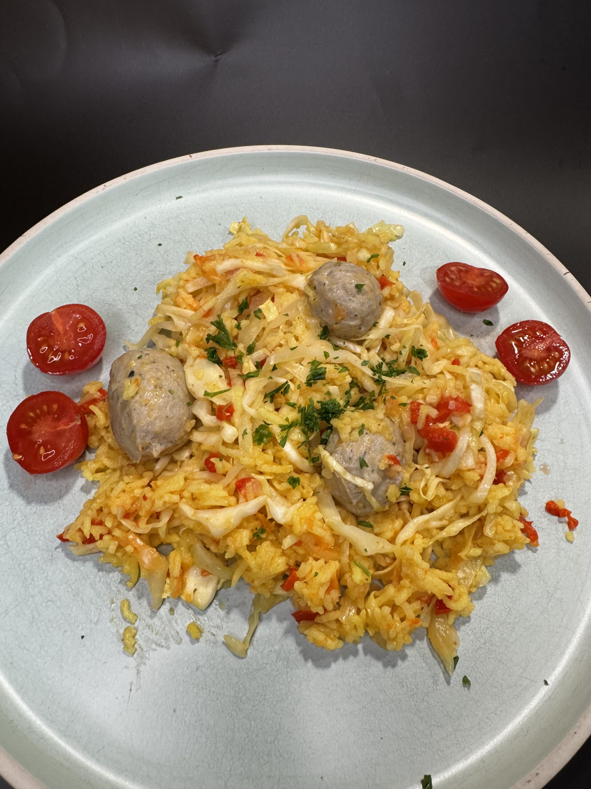 Hier gart mal wieder alles zusammen. Im Gareinsatz der Reis, im Varoma Zwiebel, Knoblauch, Paprika und Spitzkohl und ganz oben auf dem Einleger liegen aus dem Darm gedrückte Bratwurst Klößchen.
